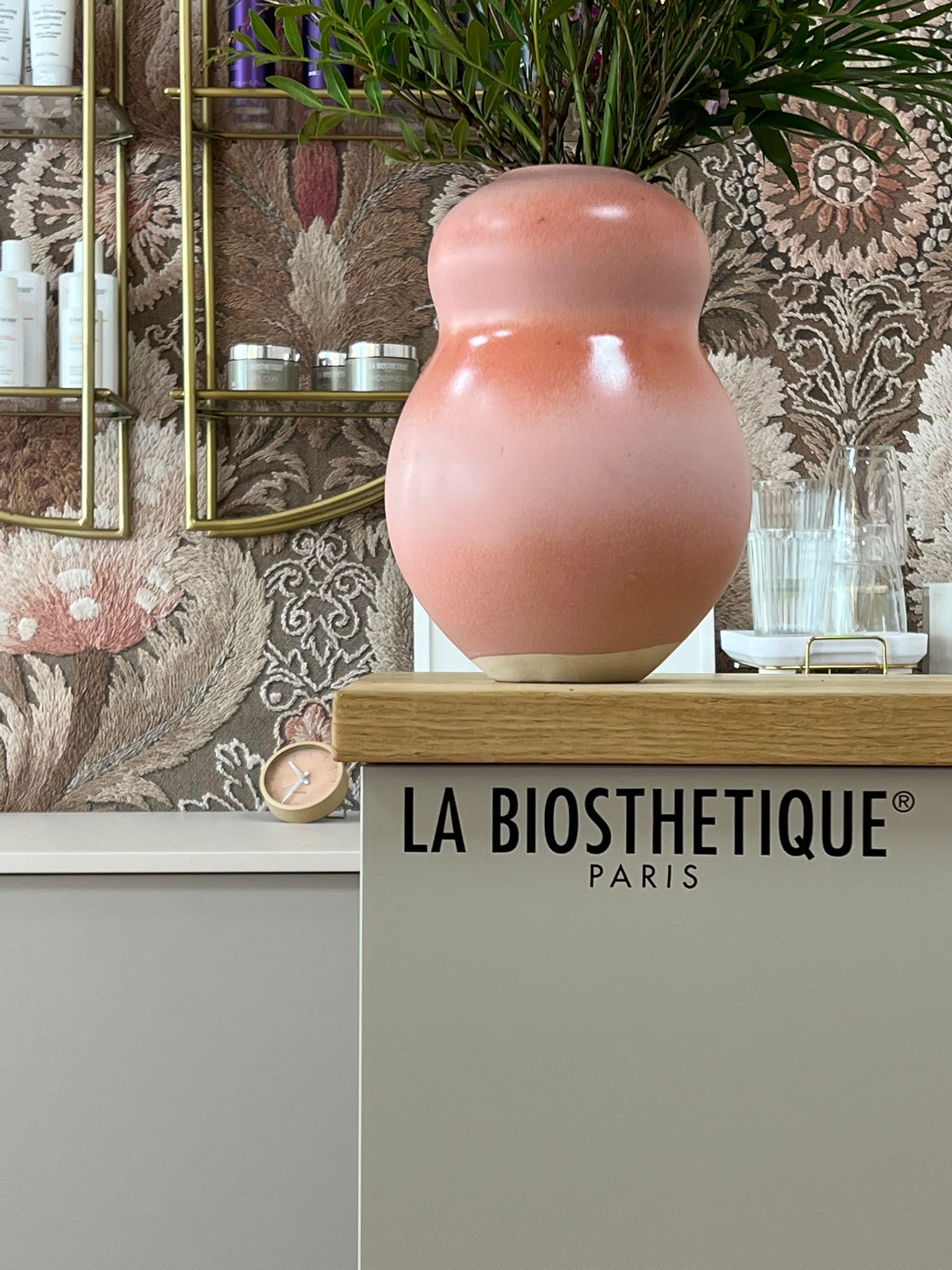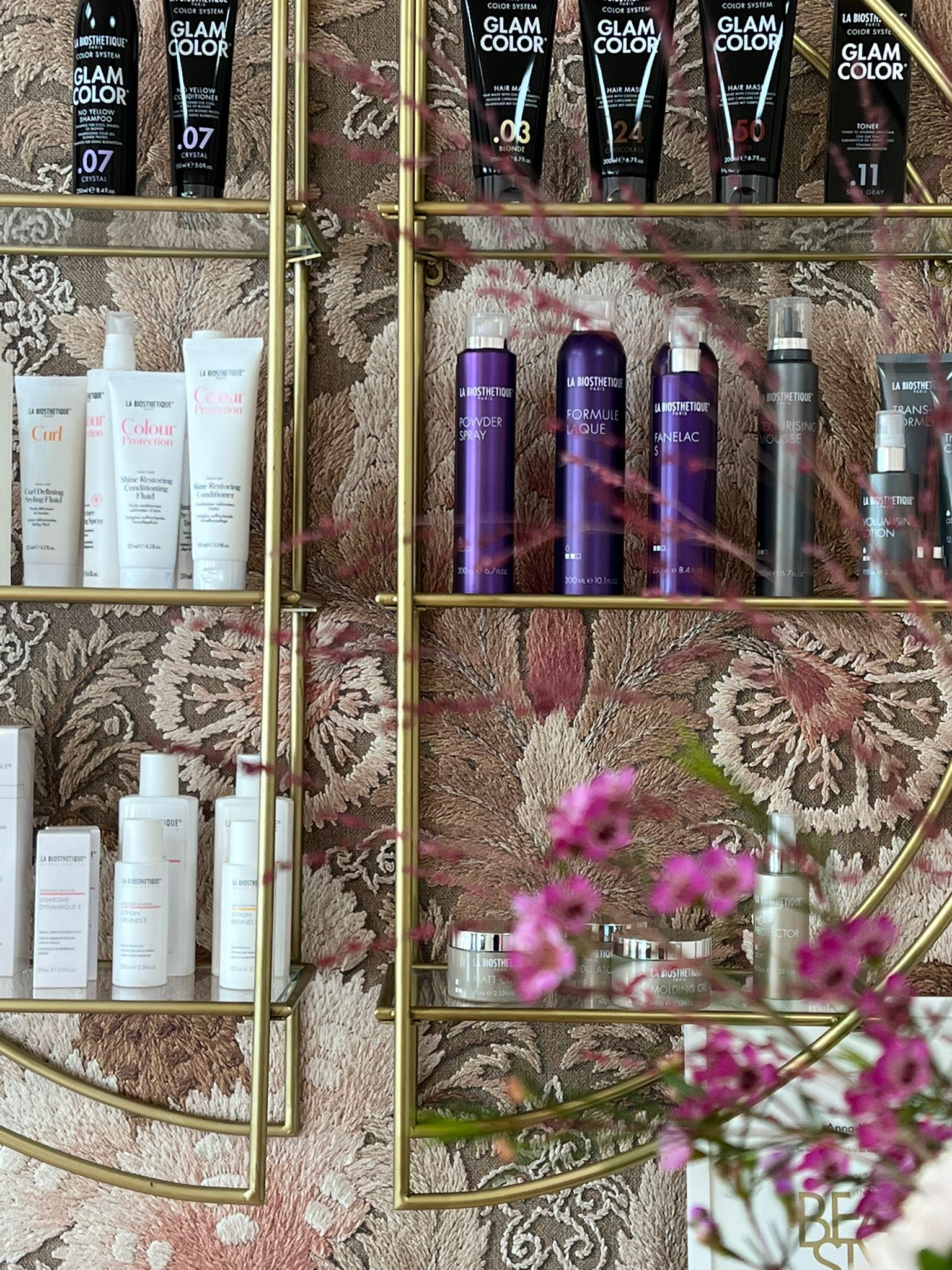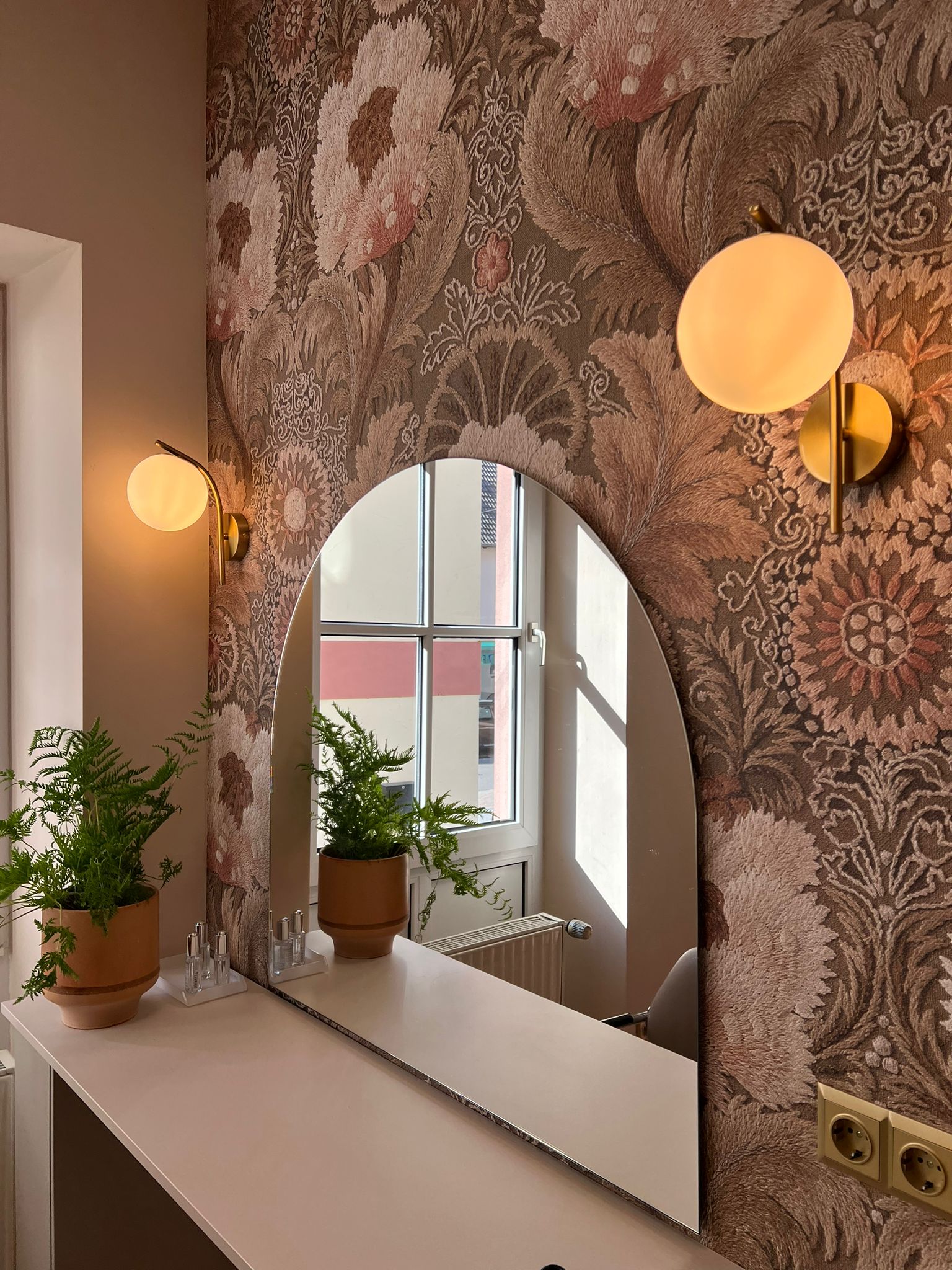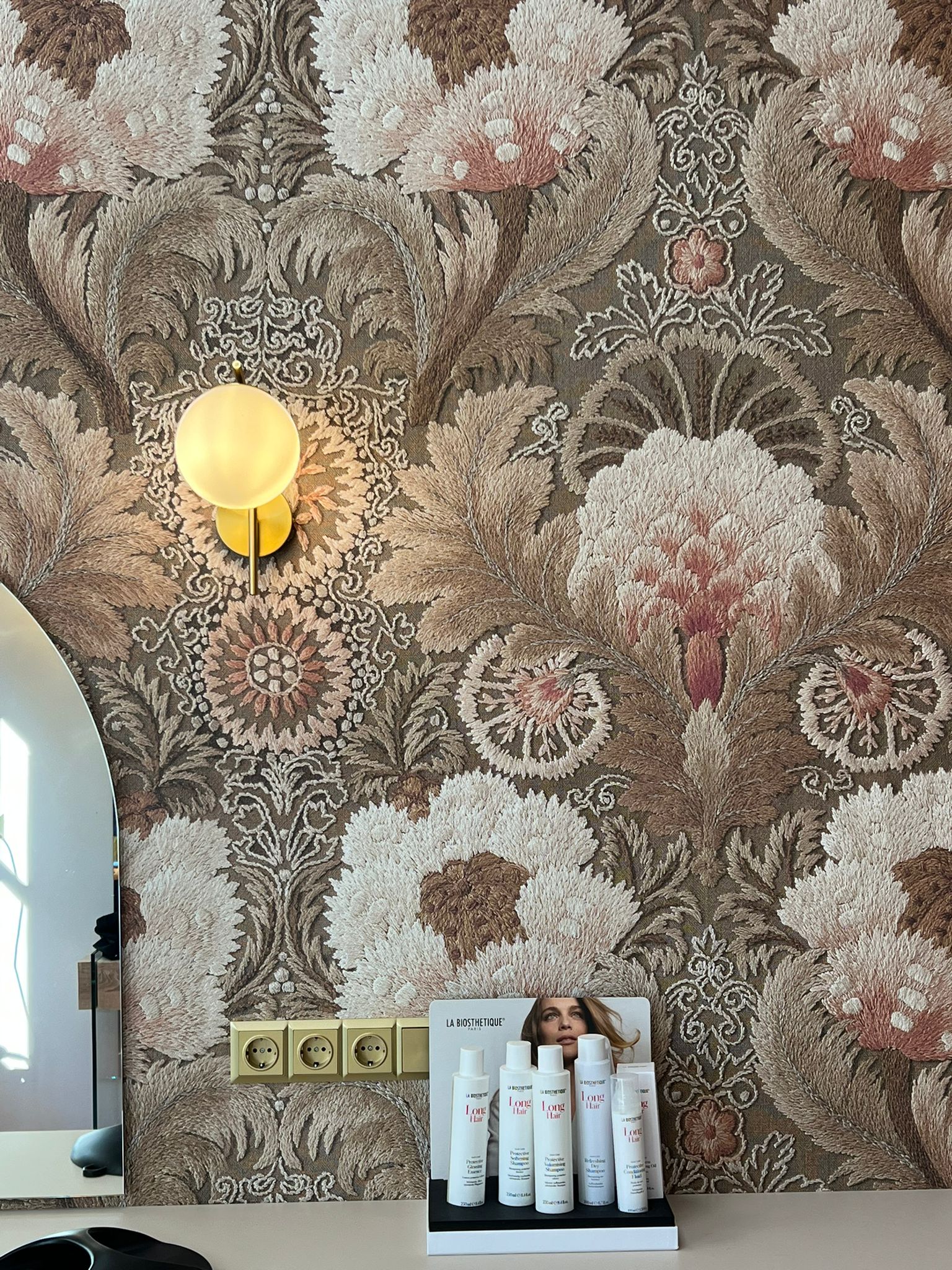 spielt eine entscheidende Rolle in der Gestaltung des Salons. Hier wurden sanfte Pfirsichtöne gewählt, die perfekt zur Ornamenttapete passen. Diese Farben verleihen dem Raum eine warme und einladende Atmosphäre, die zum Entspannen und Verwöhnen einlädt.